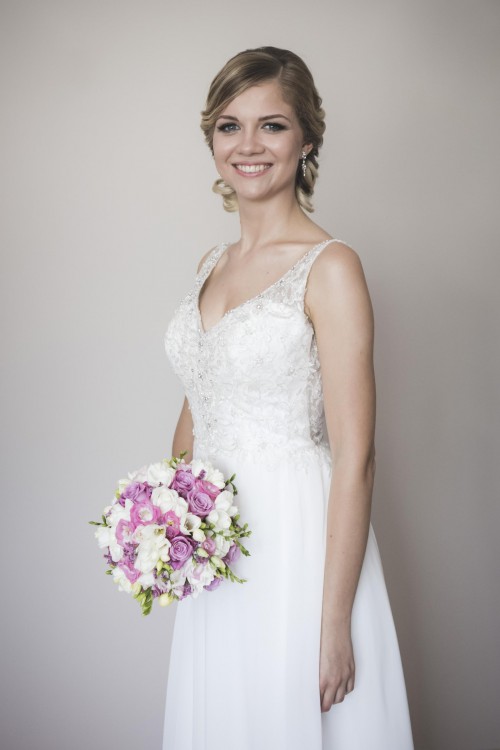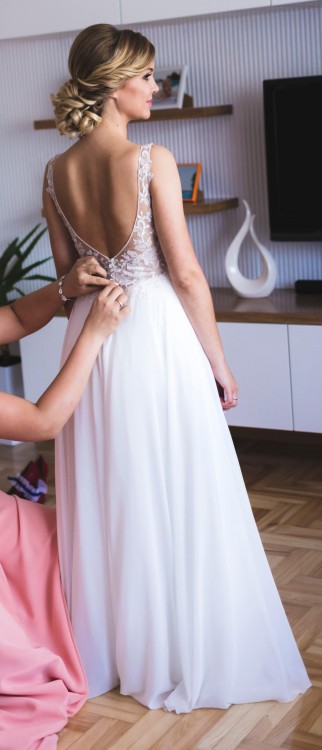 Sukienka zapinana na małe guziczki, piękne odkryte plecy, wysmuklający dekolt w kształcie liter V, sukienka ma również wszyte miseczki zatem nie ma potrzeby zakładania stanika. Góra sukni jest pokryta przyszytymi kryształkami, które pięknie się mienią w słońcu. Górna warstwa dołu sukni wykonana jest natomiast ze zwiewnego muślinu, który delikatnie wiruje w tańcu. Sukienka posiada ramiączka dzięki czemu nic się nie przesuwa i jest bardzo wygodna.