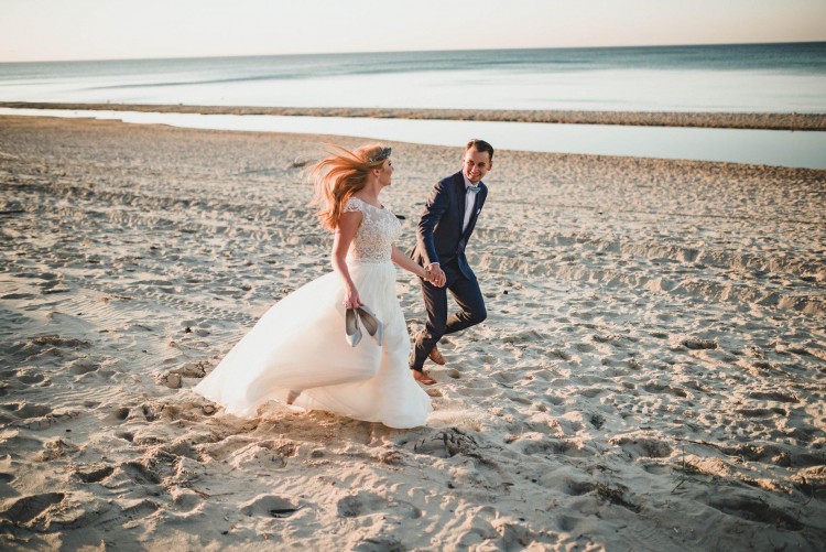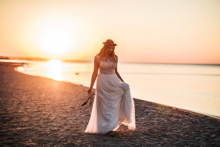 Suknia ślubna zdobiona koronką oraz perełkami, bardzo zwiewna i kobieca