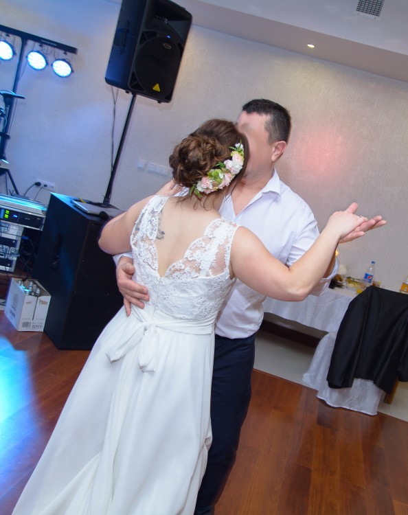 Z tyłu posiada podpinany tren - podpięty jak i puszczony prezentuje się pięknie. W pasie znajduje się pasek z tego samego materiału co dół sukni (szyfon) - z łatwością można go odpruć. Góra sukni to gorset zapinany na zamek błyskawiczny zakończony haftką. Na gorset naszyta jest piękna koronka z lekkim połyskiem.