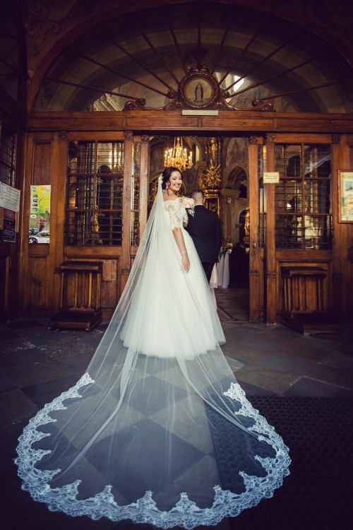 Do sukni dodaję zdobiony pas , dwa welony w kolorze ivory (długi katedralny z koronką i krótki z lamówką) oraz koło.
