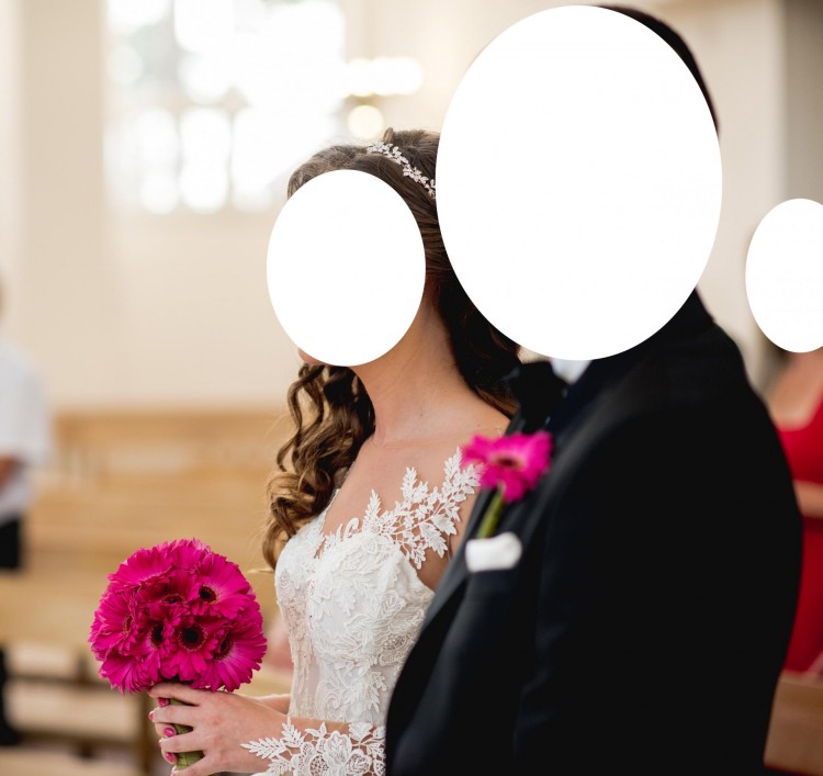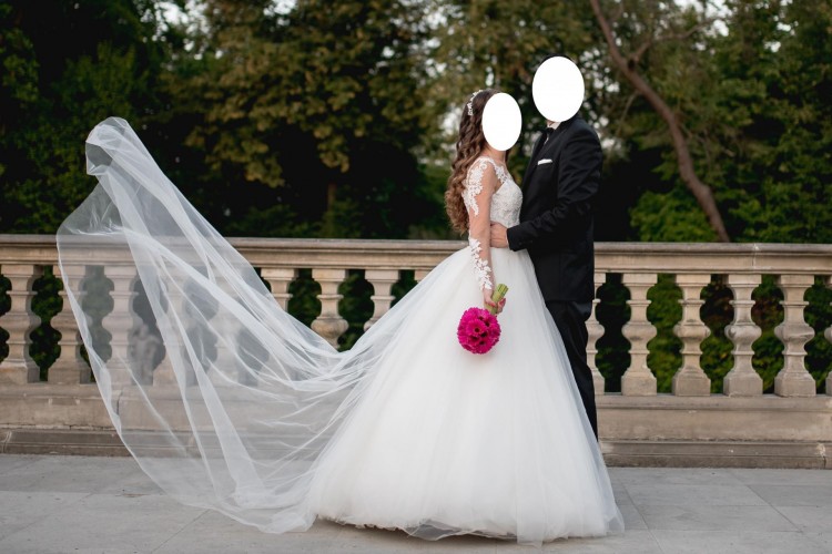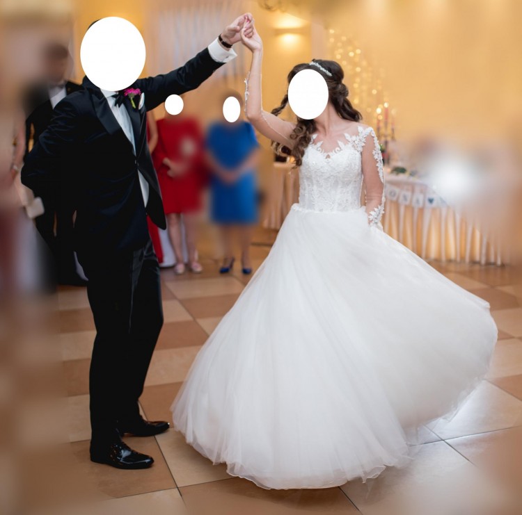 Mam na sprzedaż suknię ślubną zakupioną w salonie sukien ślubnych Laura w Toruniu. Suknia to model: góra - Enzo, dół - Margo (na dole dwie dodatkowe, umarszczone warstwy). Kolor ecru. Uszyta na wzrost 172 cm + 6 cm obcas, rozmiar 38, wymiary 81-67-96. Suknia ma długie rękawy - aplikacje (zawierające cyrkonie) zostały naszyte na kolorze cielistym. Posiada wszyty stanik. Z tyłu zasuwak i guziczki. Do sukni dołączam efektowny tren - osobno dopinany, o długości 2 metrów (od pasa), o dwóch warstwach - podszycie plus jedna warstwa tiulu - tren również Margo, oraz halkę z kołem. Suknia jest lekka i wygodna, pięknie prezentuje się w tańcu. Suknia wraz z trenem została zakupiona w salonie za 4190 zł.