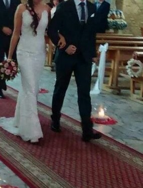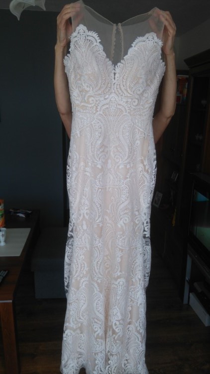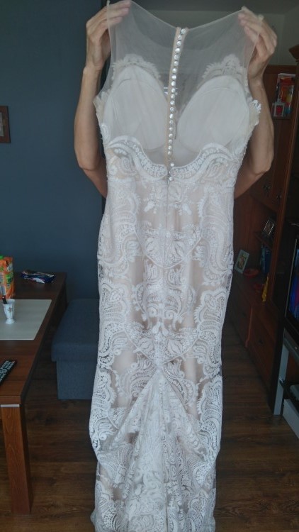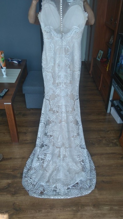 Wymiary: talia 62-67, biodra 89-93 biust miseczka od A do C. Suknia jest lekka i wygodna. Tren podpinany na guzik. Bardzo dobrze sie trzyma i przylega do ciala. Robi fajne proporcje. Suknia na weselu zrobila ogromne wrazenie.