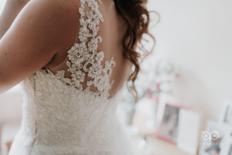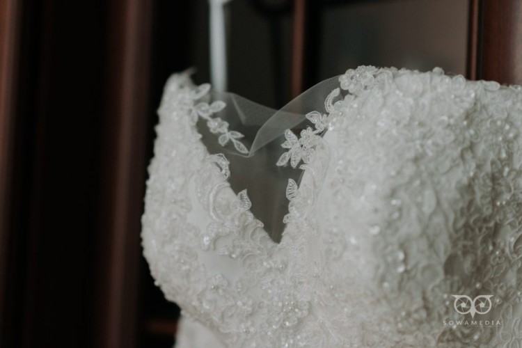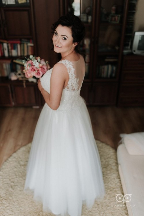 Bardzo kobieca, delikatna i elegancka suknia ślubna autorskiego projektu w kolorze śmietanowym. Góra sukni jest gorsetowana z wyciętym tyłem w kształcie V, całość zdobiona koronką na siateczce, zapinana z boku z lewej strony. Dół natomiast zbudowany jest z trzech warstw tiulu. Długość sukni od ramion wynosi 149 cm, od talii w dół ma długość 110 cm. Stan idealny. Suknia polecana jest dla kobiety: