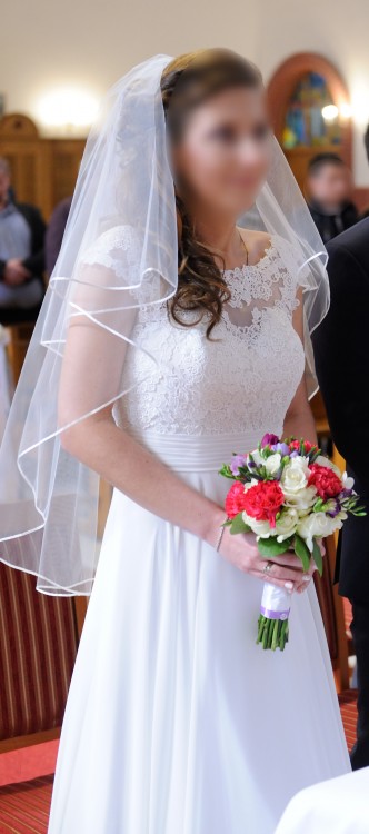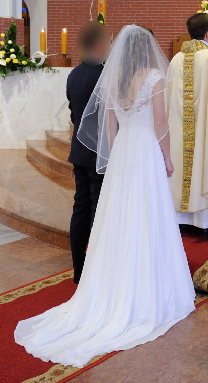 W komplecie welon oraz halka z kołem (można też nosić bez koła). Suknia wyprana w pralni chemicznej, nie posiada śladów używania.