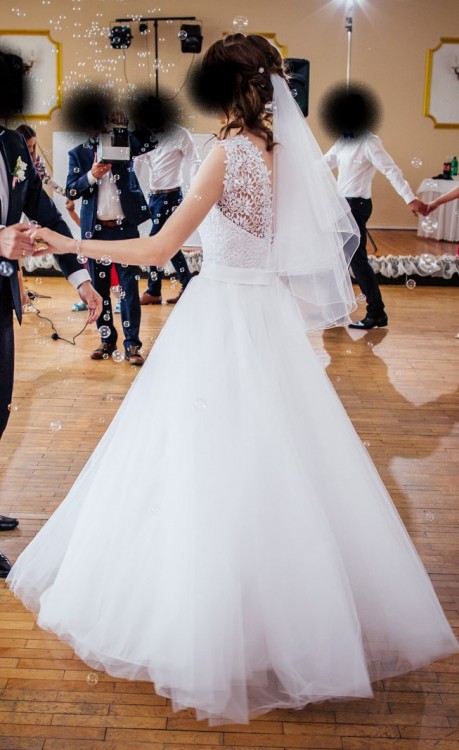 Oferuję do sprzedaży suknię ślubną w rozmiarze 36. Piękna, zwiewna w tańcu, romantyczna suknia z gipiurą na gorsecie i powyżej. Efektowny tył z rozcięciem. Polecam Paniom o wzroście powyżj 165cm i więcej. W razie pytań proszę pisać chętnie na nie odpowiem.