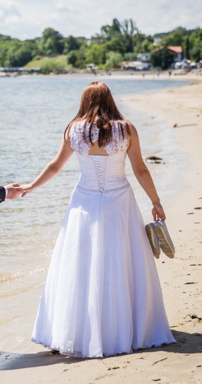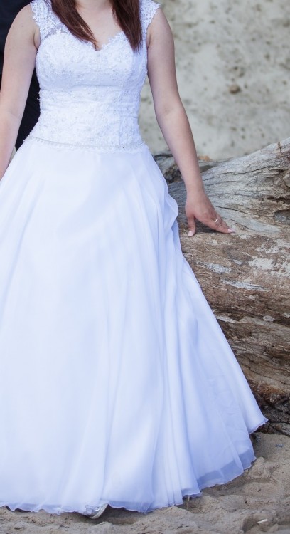 Sprzedam suknie slubna rozmiar 40-42 z kolem, szyta na miare w salonie sukien slubnych Diana w Iławie na wzrost 165 + okolo 5 cm obcas. Piekna gorsetowa gora, tyl wiazany i zapinany na guziczki. Szyfonowy dol pieknie sie uklada. Lekka, zwiewna i kobieca. Wyprana chemicznie.