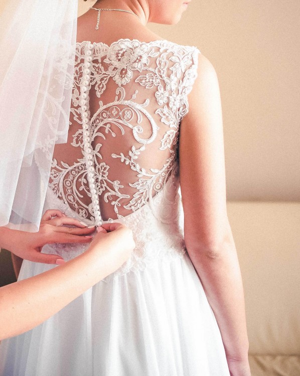 Suknia wykończona koronkami, tył zapinany na guziki. Wszyty biustonosz. W halce jest delikatne koło.