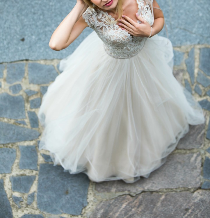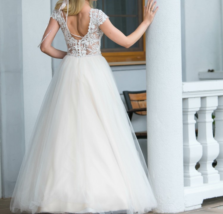 Gorset i spódnica w sukni są razem zszyte. W spódnicy pod dwiema warstwami mieniącego się tiulu jest wstawiony beżowy materiał, który nadaje spódnicy innego odcieniu i bardzo ładnie odbija się pod tiulem ( czego nie widać na zdjęciach )Suknia może być z halką która ma w sobie koło wtedy jest bardziej rozłożysta. Pięknie też prezentuje się bez halki