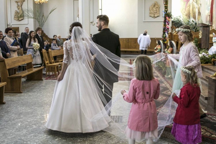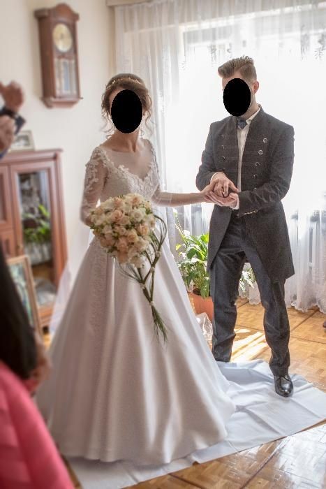 - suknię ślubną: góra z gipiury, dół z ciężkiego materiału mikado, rozmiar małe 34, kolor biel.