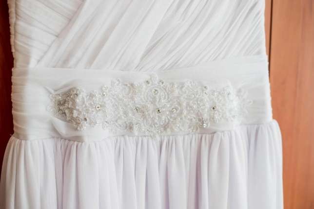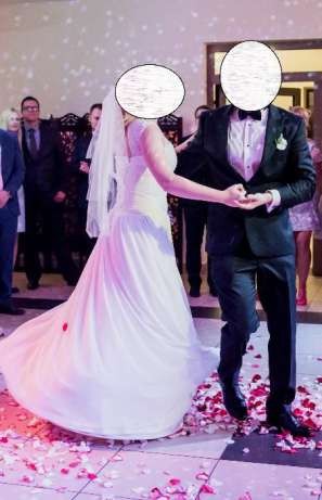 Mam do sprzedania białą suknie ślubną w kształcie litery A. Suknia była szyta na zamówienie na następujące wymiary: