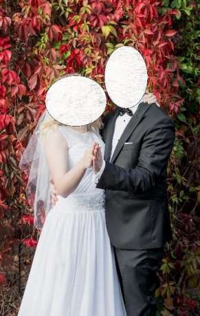 Rozmiar sukni 38/40 (możliwość regulacji dzięki sznurowaniu z tyłu gorsetu). Suknia po weselu jest w bardzo dobrym stanie. Dla dziewczyny, która zdecyduje się na zakup, dodaje welon, który również robiony był na zamówienie.