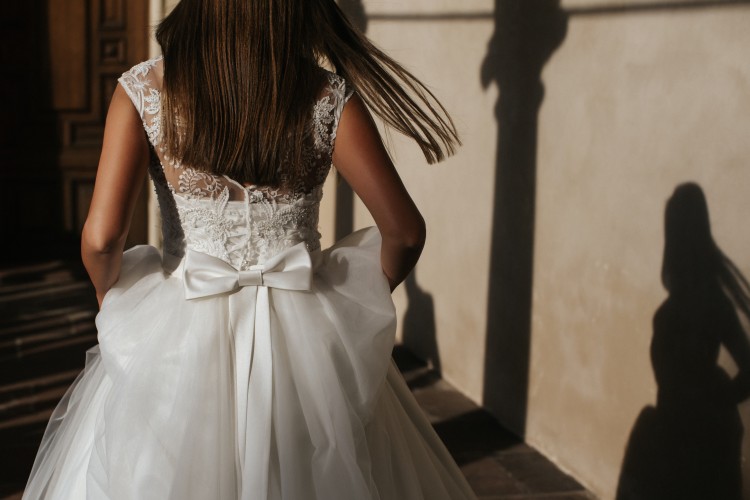 Suknia jest w kształcie litery A. Gorset jest wiązany z tyłu, dzięki czemu bez problemu dopasuje się do rozmiaru 36/38. Dół sukni składa się z kilku warstw tiulu, jednej warstwy satyny, podpinanego trenu i halki z kołem (regulowana szerokość i długość sukni). Widoczna z tyłu kokarda jest odpinana.