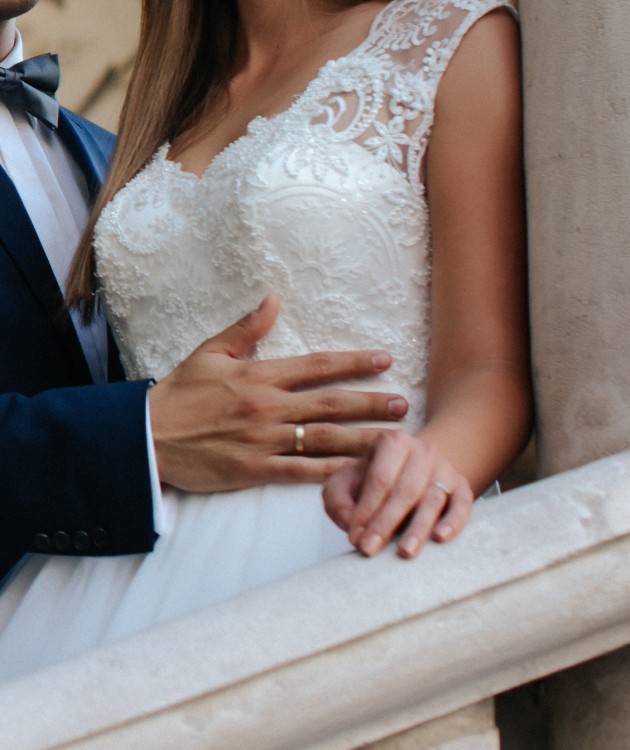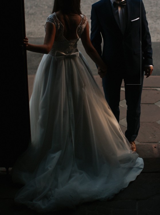 Suknia była założona dwa razy na ślub i sesję zdjęciową.
