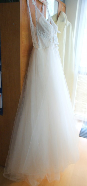 Tył sukni jest odrobinę dłuższy niż przód. Plecy są odkryte w literkę V. Po boku widzimy lekką siateczkę. Suknia ma wszyte miseczki rozm 85 C (można wszyć większe lub mniejsze).