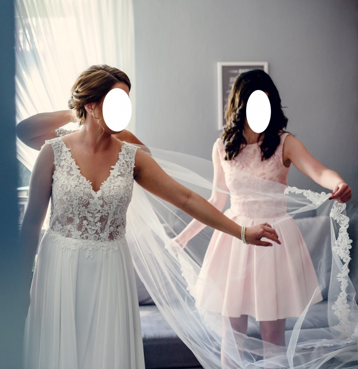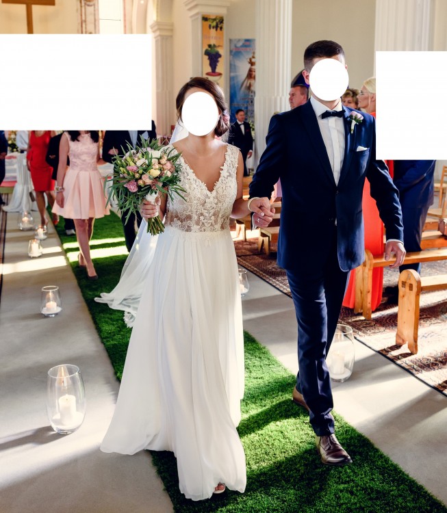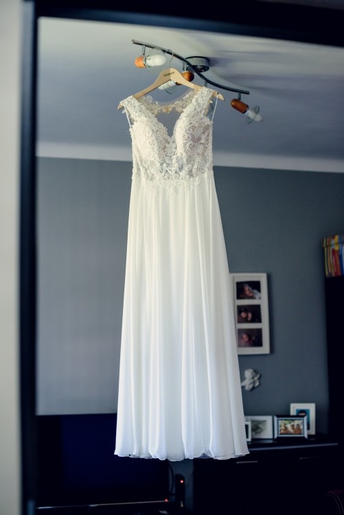 Materiał: góra koronkowa na cielistym podszyciu, które jest niewidoczne zlewa się ze skórą. Dół sukni to zwiewny muślin.