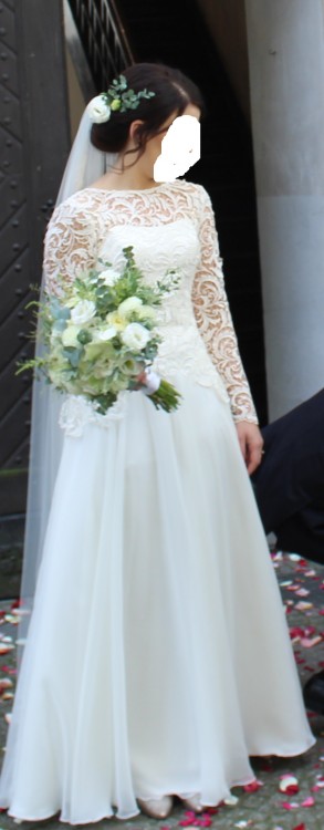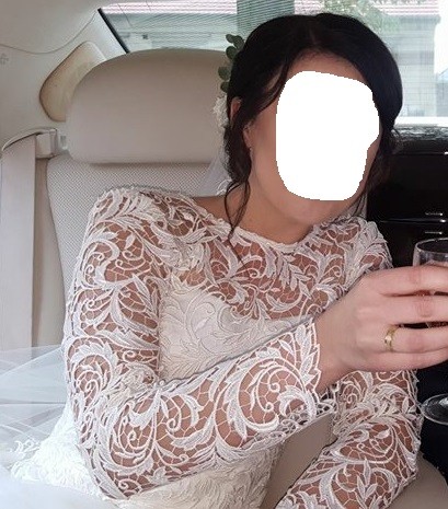 Suknia szyta na miarę według indywidualnego projektu. Gór sukni piękna gipiura w rozmiarze 36/38 w biuście 75B . Dół sukni lejący muślin na wzrost ok 164 cm. kolor sukni ecru. Suknia ubrana podczas ślubu i na sesje zdjęciową.Delikatna, zwiewna i bardzo wygodna. Zapinana na zamek błyskawiczny z lekkim wycięciem na plecach . Do sukni dołączam długi welon obszyty taśma z gipiury z której jest suknia. Przed sprzedażą oddam do czyszczenia chemicznego na mój koszt.