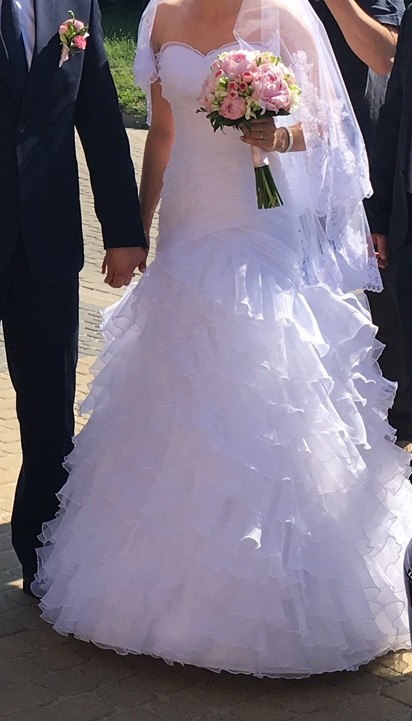 Suknia uszyta na wzrost 176 cm + 7/8cm obcas. Dzięki falbanom bardzo łatwo skrócić spódnicę.