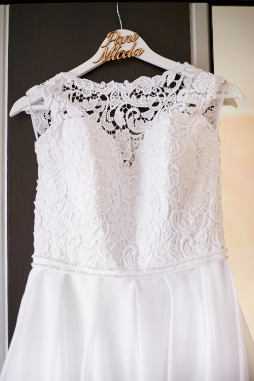 Góra sukni wykonana z przepięknej gipiury natomiast dół sukni jest inny niż w pierwotnym modelu przez co suknia jest niepowtarzalna - lekki z domieszką jedwabiu, bardzo zwiewny z rozcięciami, które pięknie układają się w tańcu.