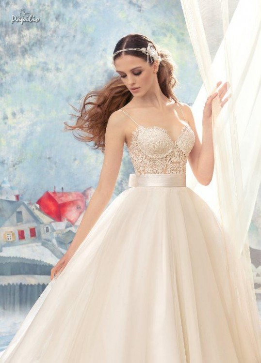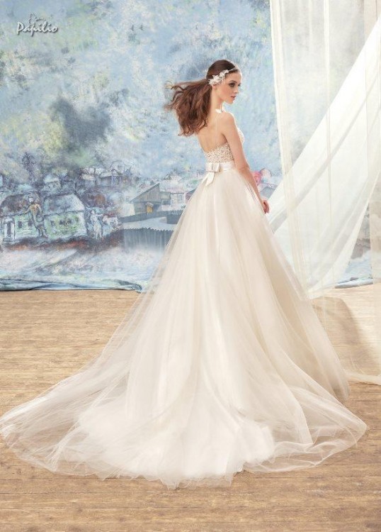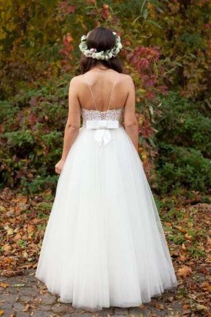 Góra sukni posiada gorset na cieniutkich ramiączkach, oraz wszyte miseczki podkreślające biust. Pasek w talii zapinany jest na 3 guziczki z kokardą z tyłu. Dół to kilka delikatnych, zwiewnych warstw tiulu pięknie układających się w tańcu. Tren został ucięty ze względu na wygodę i estetykę. Suknia jest niesamowicie wygodna, rewelacyjnie podkreśla talię. Może być na kole lub bez (koło dodaję gratis).