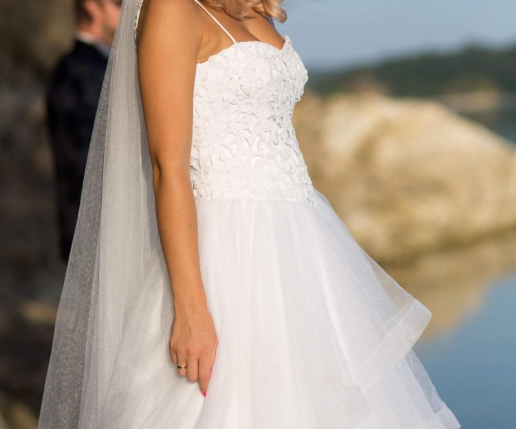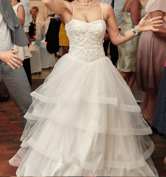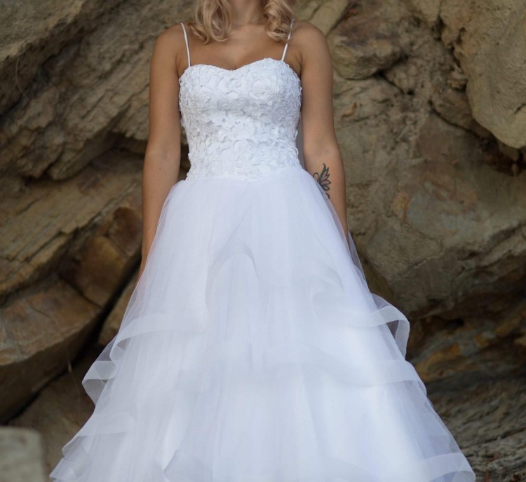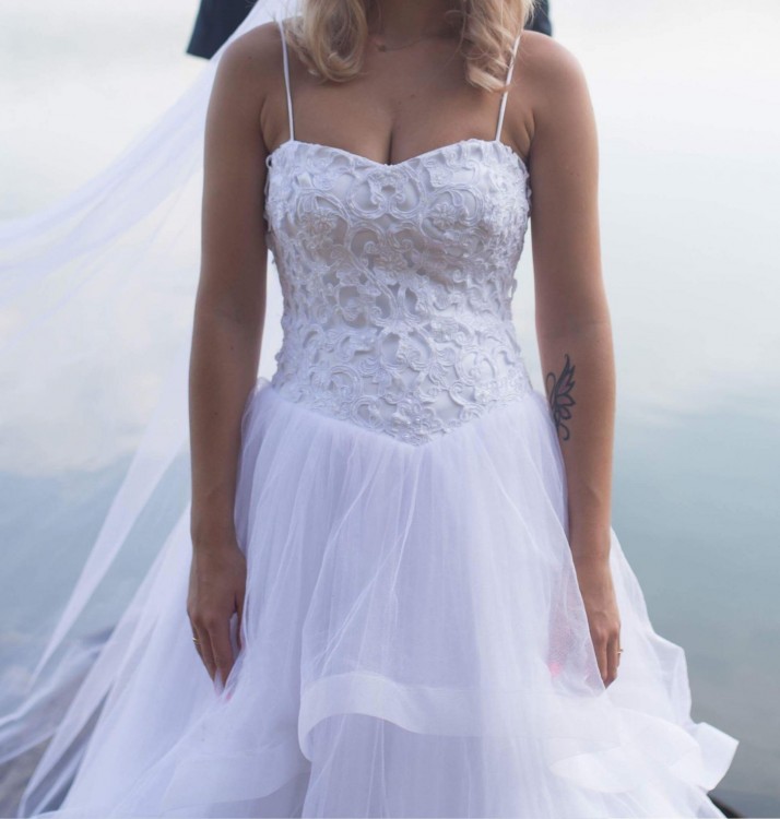 Sprzedam suknię ślubną. Suknia była szyta na miarę, rozmiar 32/34, wzrost 166cm plus 8cm obcas. Suknia o kroju księżniczki z oryginalnym dołem z czterema warstwami tiulu. Gorset z koronki w kształcie serca z cienkimi, ramiączkami. Plecy odsłonięte, pokryte koronka taką z gorsetu. Suknia wyprana w pralni chemicznej. Cena 1400 zł do negocjacji