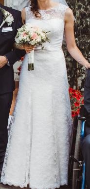 Mam do sprzedania koronkową suknię ślubną zakupioną w salonie (cena katalogowa 3400 zł) i przerobioną wg własnego pomysłu. Kolor biały, rozmiar 34/36. Zainteresowanym mogę podać dokładne wymiary. Szyta na osobę 164 cm plus 4 cm obcas. Suknia posiada tren, który się podpina, bardzo wygodna.