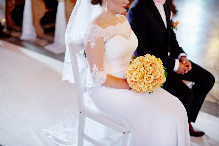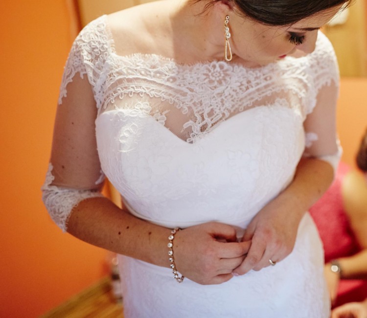 Suknia ślubna wykonana z gazy, tiulu i koronki.Rękawki 3/4,i szalenie kobiecy dekolt oraz unikalne, ręcznie wykonane elementy aplikacji koronkowej tworzą model sukni szalenie eleganckiej. Rozmiar sukni 38/40, wzrost 160 + obcas 4 cm. Zapinana z tyłu na guziczki, dodatkowo schowany jest wiązany gorset , aby mogła lepiej dopasować się do figury. Suknia posiada wszyty tren, który podpina się pod spód sukni, dzięki temu nie przeszkadzała mi w tańcu. Dodatkowo do sukni dorzucam krótki welon.