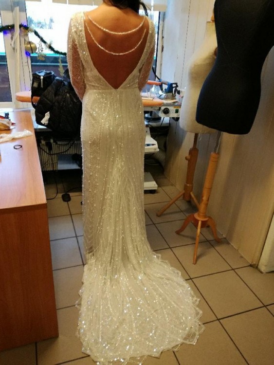 posiadam na sprzedaż piękną suknię ślubną w kolorze śmietankowym z pięknej mieniącej sie koronki na delikatnej podszewce. Tył sukni pięknie ozdabia podpinany tren i mocno wycięte plecy z ozdobnymi koralikami svarovskiego.