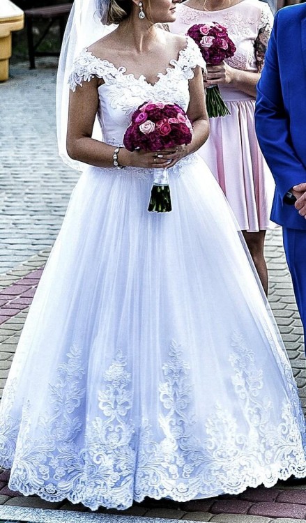 Suknia w kolorze śnieżnobiałym, uszyta na wymiar, bogato zdobiona koronką. Uroku dodatkowo dodają opadające ramionka, które można sobie śmiało regulować. Tył sukni pięknie wycięty delikatnie podkreślający plecy. Regulowana gorsetem, można ją dopasować do figury. (Rozmiar 36/38)