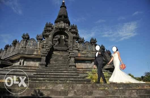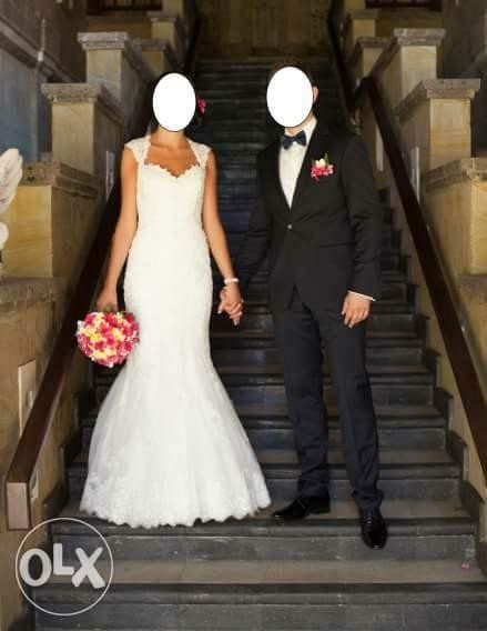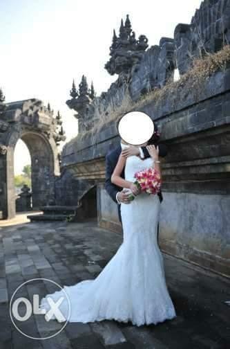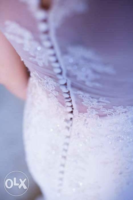 Suknia jednoczęściowa w stylu syreny, dekolt w kształcie serca. W sukni zostały odcięte rękawy ze względu na ślub w ciepłych krajach. Dodatkowo dekolt został wykończony koronką co dodało sukni elegancki.