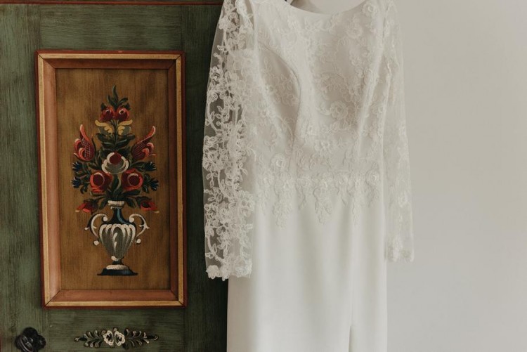 Góra to wysokiej jakości koronka długi rękaw i odkryte do połowy plecy, dół prosty z rozcięciem do połowy uda, ma wszyte miseczki , także nie jest potrzebny żaden biustonosz.Kolor ecru długość to 163+8cm obcas rozmiar S