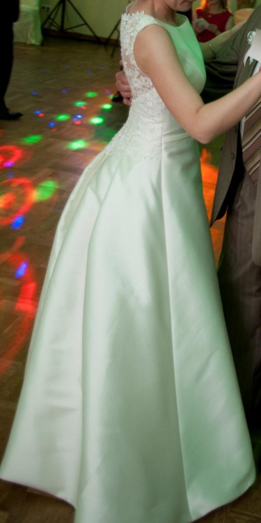 faktyczny rozmiar sukni to takie 36/38 wymiary osoby na którą była szyta to 168cm wzrostu 59kg żywej wagi ;p około 72cm w pasie 80cm biust. Fajną sprawą jest lekkie podniesienie kuperka w sukni co optycznie wysmukla nam talię.