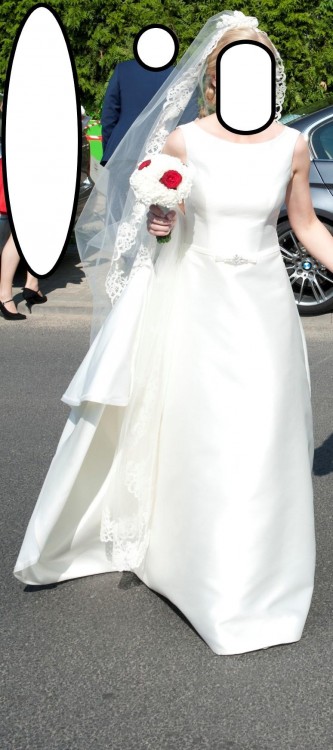 klasyczna suknia ślubna "litera A" prosty fason, z przodu gładki zdobiony maleńką broszką na pasku.