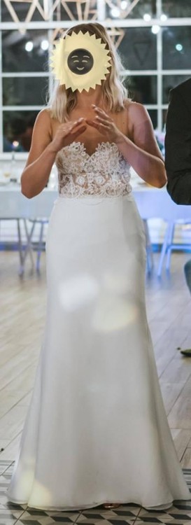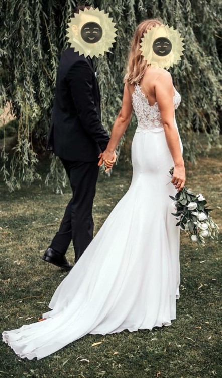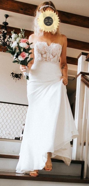 Sprzedam suknie ślubną z salonu Mariella. Posiada podpinany tren. Szyta na 169cm +7cm obcas. Góra to korona z siateczka i wszytym Stanikiem w rozmiarze B/C. Dół to 4 warstwy materiału dzieki czemu pięknie sie układa. Mogę dorzucić w gratisie opaskę z kryształkami swarowskiwgo (warta 150zl)