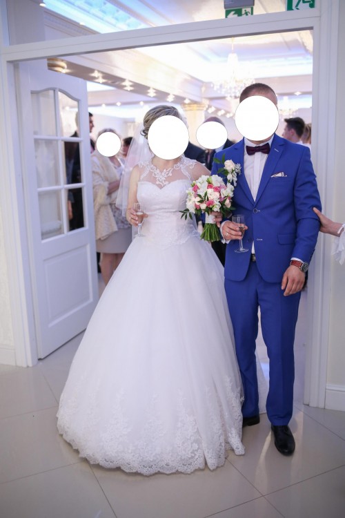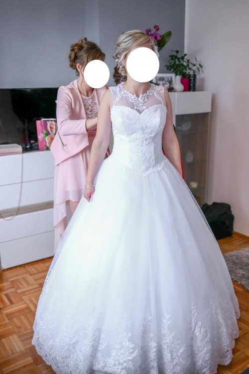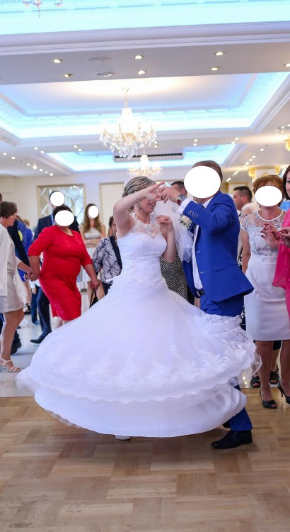 Stan sukni jest bardzo dobry. Rozmiar 36 do 42 (sznurowany gorset więc można ją odpowiednio dopasować do figury). Kolor biały. Spódnica uszyta z wielu warstw tiulu, dołączone jest również koło. Pięknie się układa i jest lekka. Suknia posiada również wszyte miseczki - nie ma potrzeby zakładania biustonosza. Bardzo ładnie prezentuje się na żywo, podczas tańca nieziemsko się układa. Suknia pięknie się prezentuje.