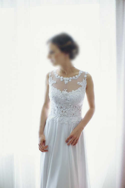 Z przodu sukni piękne rozcięcie, góra wykonana z gipiur z wszytymi poduszkami na biust (nie push-up!), tył sukienki zapinany na guziczki.