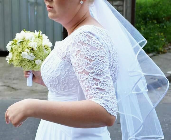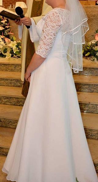 Witam, mam na sprzedaż białą, jednoczęściową, gładką suknię ślubną,w kształcie litery A, rozmiar 38-42, na wzrost 176 cm (+ 6,5 cm obcas). Górna część część sukni to koronka z rękawem ¾ (koronka delikatna i miękka). Tył sukienki jest wiązany, dlatego też można ją dopasować do każdej figury. Na plecach sukienka jest delikatnie wycięta. Pasek jest marszczony i posiada cekiny z koralikami. Jej stan oceniam na idealny, nie dotykała ziemi, była ubrana tylko raz. Suknia jest po praniu chemicznym. Została nałożona na nią dodatkowa warstwa „aperatury”, która chroni suknię przed zabrudzeniami.