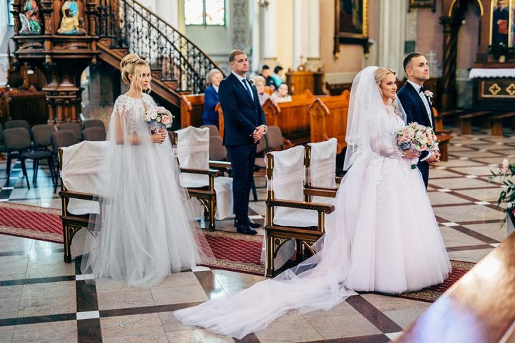 Sukienka składa sie z białego gorsetu oraz dołu wykonanego z tiulu (kilka warstw) w kolorze pudrowego różu, a na całość naszyta jest piękna, hiszpańska koronka z kwiatuszkami 3D. Góra wykonana jest ze specjalnej elastycznej siateczki, ktora nie krępuje ruchów i nie ma problemów z podnoszeniem rąk w trakcie tańca. Do sukienki uszyty jest dopinany na guziczki tren ok. 3 metrów długości. Efekt jest niesamowity. Pod sukienke posiadam rownież kilkuwarstwowa halkę, ktora daje fenomenalny efekt. Sukienka jest bardzo wygodna i zachwyca swoją oryginalnością.