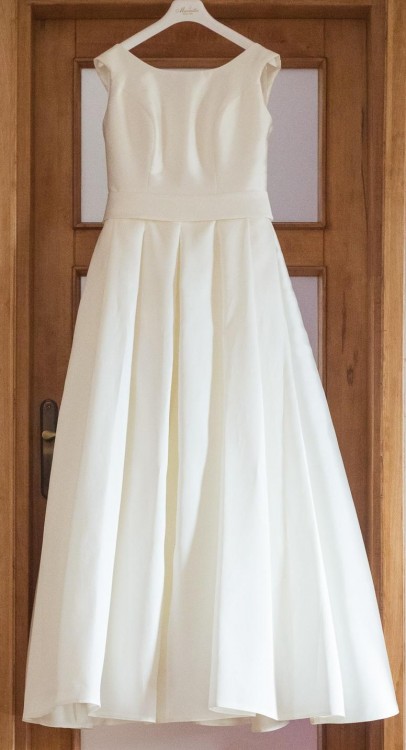 Suknia w rozmiarze 40 z możliwością zwężenia oraz skrócenia, material - satyna Mikado, kolor ecru. Z tyłu zamek oraz ogromna, przepiękna kokarda. Kokarda jest na pasku. Z przodu niewidoczne kieszenie. Chętnie podeślę więcej zdjęć na priv.