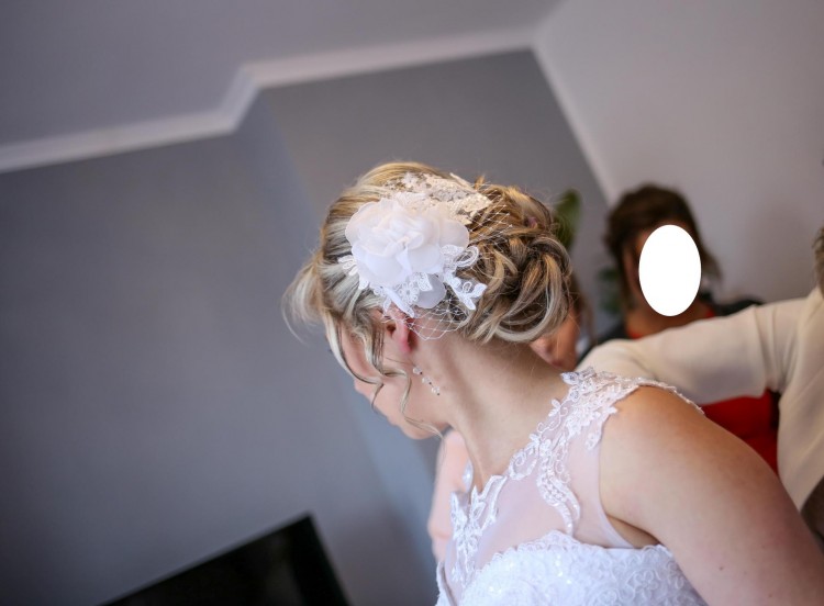 Posiadam również krótki welon z grzebykiem zdobiony kryształkami na lamówce oraz kwiatek do włosów, który dorzucam GRATIS. Możliwość poprawek w salonie w którym kupiłam. Gorąco polecam.