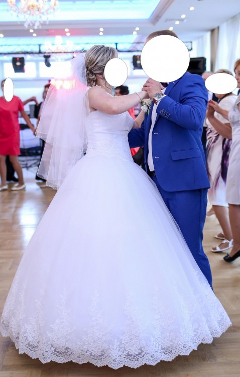 Stan sukni jest bardzo dobry. Rozmiar 36 do 42 (sznurowany gorset więc można ją odpowiednio dopasować do figury). Kolor biały. Spódnica uszyta z wielu warstw tiulu, dołączone jest również koło. Pięknie się układa i jest lekka. Suknia posiada również wszyte miseczki - nie ma potrzeby zakładania biustonosza. Bardzo ładnie prezentuje się na żywo, podczas tańca nieziemsko się układa. Suknia pięknie się prezentuje.