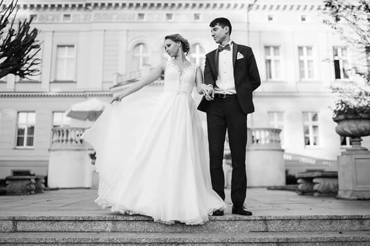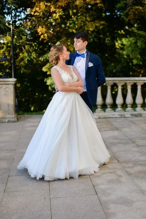 Góra koronkowa z głębokim dekoltem pięknie podkreśla nawet niewielki biust , zdobienia na pasie dodają błysku i elegancji a nietypowy dół sukni zrobiony z pasów materiału zachwyca nie tylko Ciebie ale i gości podczas tańca, uwierzcie nie mogłam się na nią napatrzeć podczas obrotów :)