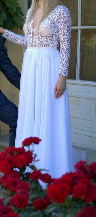Witam mam do sprzedania piękna suknię ślubną. Ubrana dwa razy na ślub i na sesję, teraz już jest wyprana i wygląda jak nowa. Jest bardzo wygodna, posiada kryty zamek z boku sukni jak i efektowne guziczki z tyłu. Uszyta została z eleganckiej koronki gipiury z przezroczystymi cekinkami mieniacymi się pięknie, dół zaś uszyty ze zwiewnego muslinu. Rozmiar 38 wzrost 170.