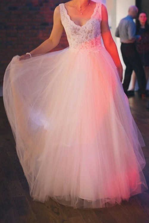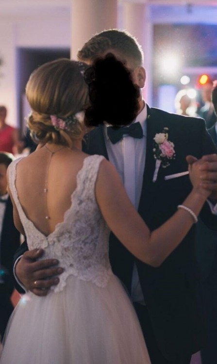 Góra sukni jest uszyta z delikatnej podwójnej koronki, aby za bardzo nie prześwitywała. Dół sukni składa się z sześciu warstw nierównomiernego tiulu. Tiul był sprowadzany z Włoch. Jest ona koloru bieli śmietankowej z delikatnymi wstawkami tiulu koloru szampańskiego. suknia jest bardzo lekka i zwiewna. Cudnie prezentuje się w tańcu oraz na sesji ślubnej. moje wymiary to :