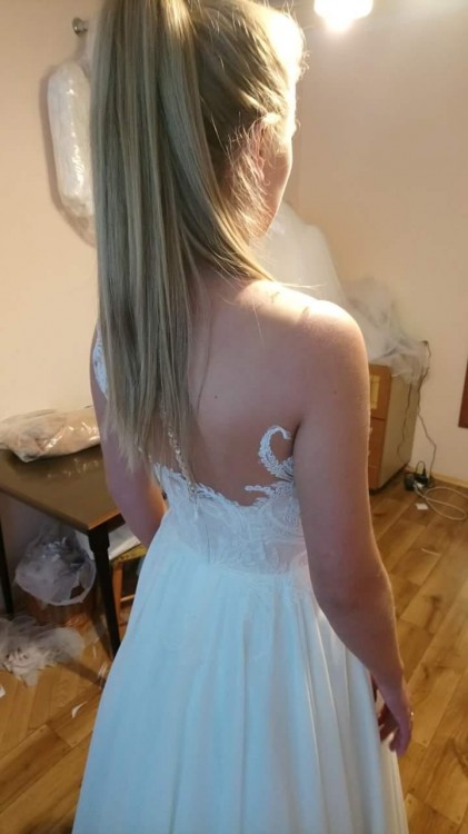 Sprzedam suknie ślubną Papa Michel. Suknia szyta była na wzrost 165 cm plus 9 cm obcas, rozmiar sukni 36, kolor ivory, dół sukienki muślinowy. Lekka, zwiewna, pięknie falująca podczas ruchu. Posiada cielistą siateczkę, która idealnie dopasowuje się do koloru skóry. Zapinana na zamek i guziki do samej góry. Do sukni dorzucę długi welon i krótki. Suknia wyprana. Cena do negocjacji. Więcej informacji na priv. Gorąco polecam ;)