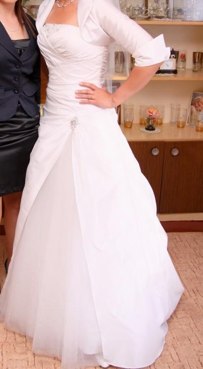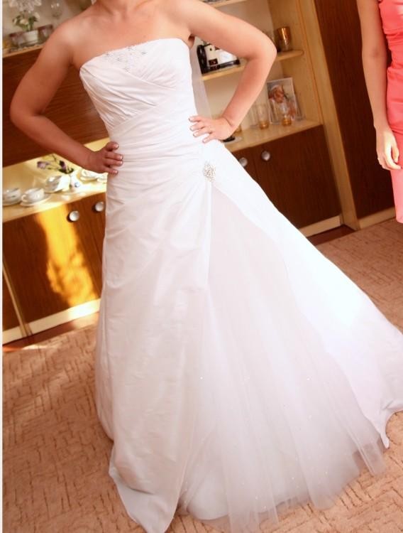 Zapraszam do zakupu przepięknej sukni ślubnej. Suknia w kolorze białym, rozmiar 38, ze sznurowaniem i zamkiem dzięki czemu będzie pasować również na inne rozmiary (można ją dopasować do sylwetki). Długość sukni 170 cm + 5 cm obcasa. Suknia jest jednoczęściowa, wykonana z jednolitego materiału z wstawką z tiulu z boku sukni. W tym miejscu ma piękne zdobienie z kryształków. Posiada także zdobienie na biuście, przez co ładnie go eksponuje. Jest lekka i wygodna. Krój literki A i szycie w tali wyszczupla optycznie sylwetkę. Suknia posiada podpinany tren, który elegancko wygląda w kościele, a podpięty nie przeszkadza na sali weselnej.