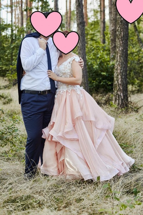 Szyta na zamówienie. Góra szyta z koronki, pod spodem jest gorset, którego nie widać. Dolny materiał to organza, koloru szukałam baaardzo długo :) Suknia jest unikatowa, z pewnością nikt oprócz mnie nie miał takiej samej.