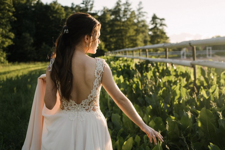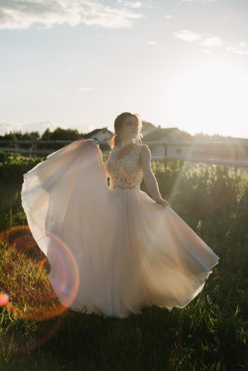 Suknia jest biała w ciepłym odcieniu, wykonana z koronki i muślinu. Jedna z warstw sukni jest kremowa, co ociepla biel prześwitującego muślinu. Sukienka jest delikatna, a zarazem efektowna dzięki odsłoniętym plecom oraz koronce, która subtelnie odsłania ciało.