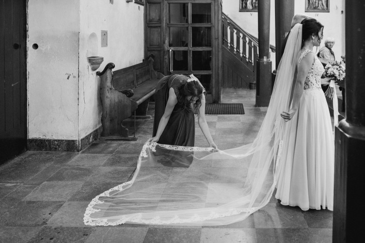 Długi welon jest obszyty tą samą koronką, co suknia i perfekcyjnie dopełnia całą kreację. Koronka pięknie będzie się prezentować, w drodze do ołtarza.