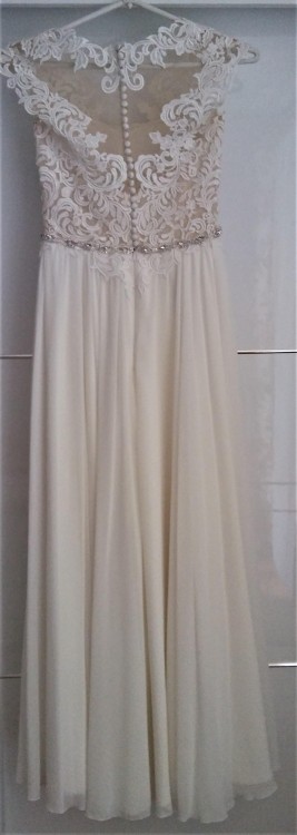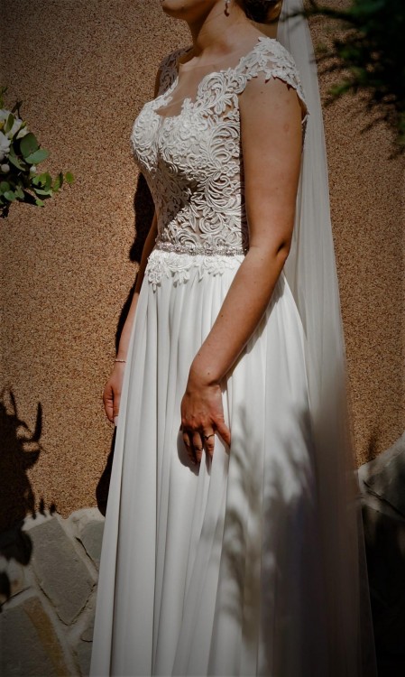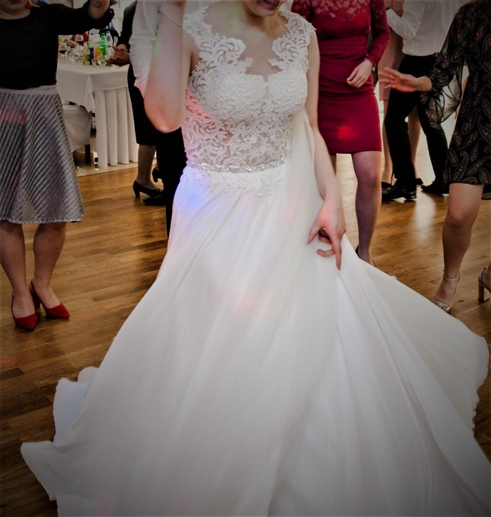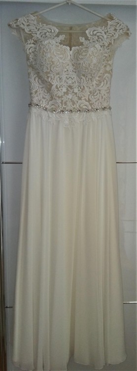 Mam do sprzedania piękną suknię ślubną zakupioną w salonie Eurostyl w Nowym Sączu w 2017 roku (model 051). Suknia w kolorze écru, bardzo lekka i zwiewna. Góra wykonana z gipiury na cielistej siateczce, która jest prawie niewidoczna, dół wykonany z muślinu podszywany satyną dzięki czemu suknia jest wygodna i nie plącze się. Całość dopełnia srebrny pasek wszyty na wysokości talii (jest możliwość jego zmiany bądź usunięcia). Suknia szyta na wzrost 165 plus 6 cm obcas, rozmiar 36/38. Do sukni dorzucam delikatny, pojedynczy welon długi do ziemi. Sukna założona 2 razy ( 1 raz w dniu ślubu, drugi w dniu sesji plenerowej). Wyczyszczona w salonie ślubnym. Zachęcam do obejrzenia i przymiarki.