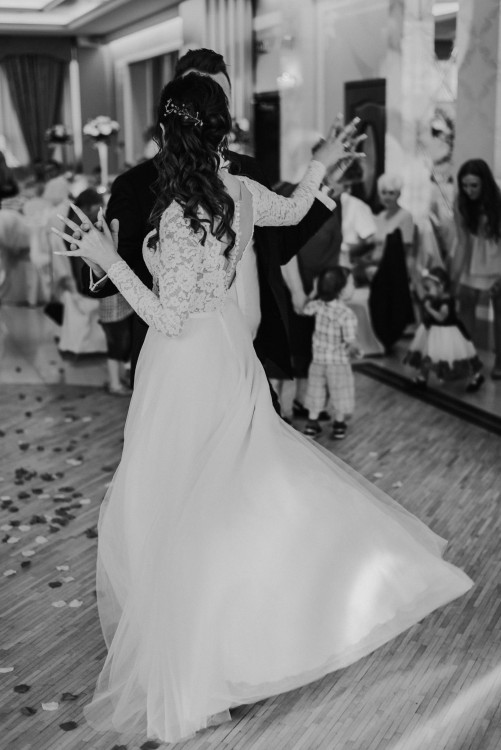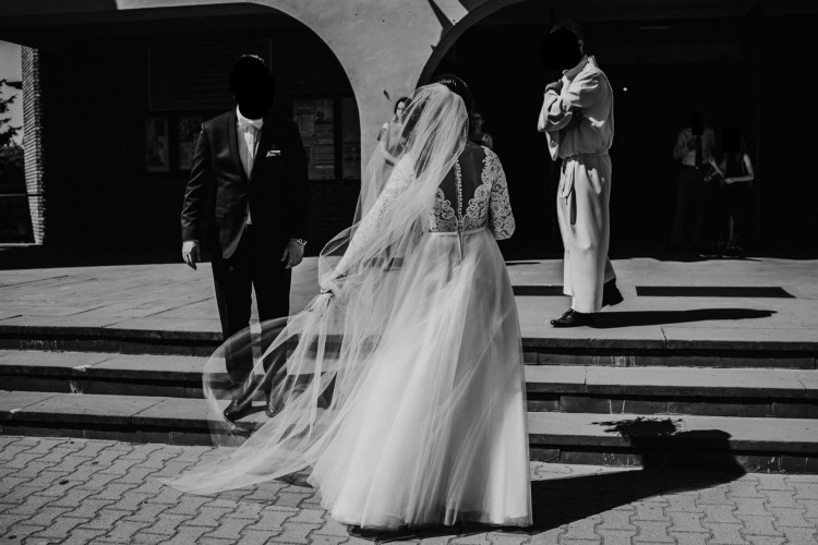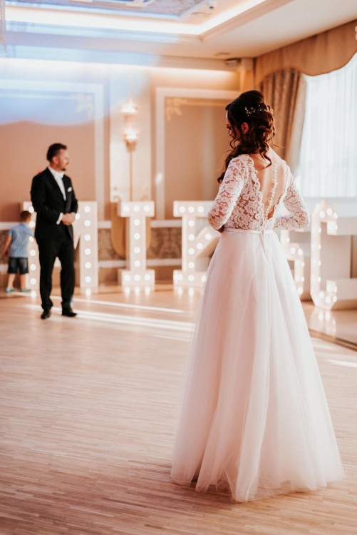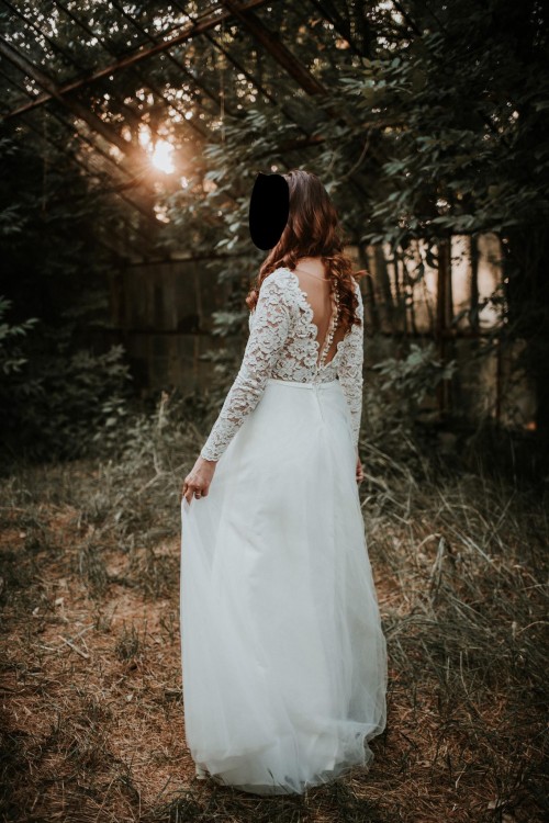 Suknia jest juz po praniu, gotowa do przymiarki. Góra zrobiona jest z koronki na siateczce więc jest lekko rozciągliwa. Suknia posiada duży rozporek, który można zszyć na dowolną wysokość. Na dole sukni jest drobne uszkodzenie tiulu, które jest niewidoczne na całości sukni. Suknie można skrócić i nie straci swojej formy.